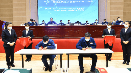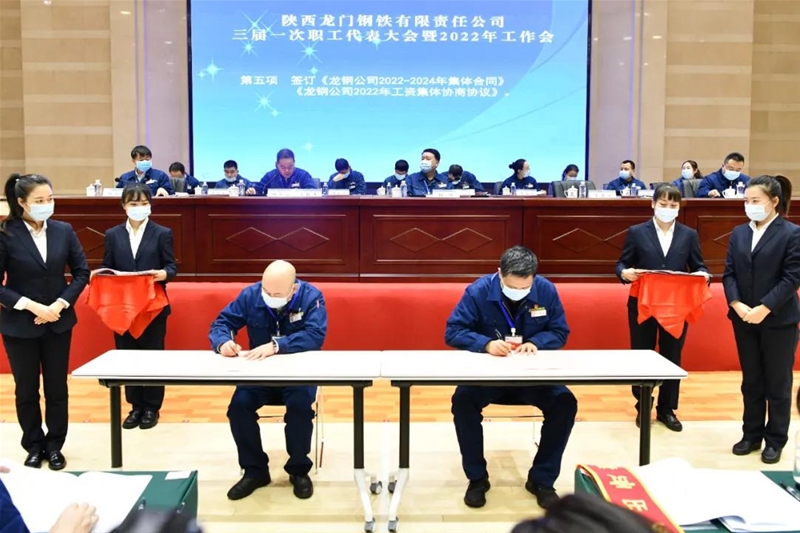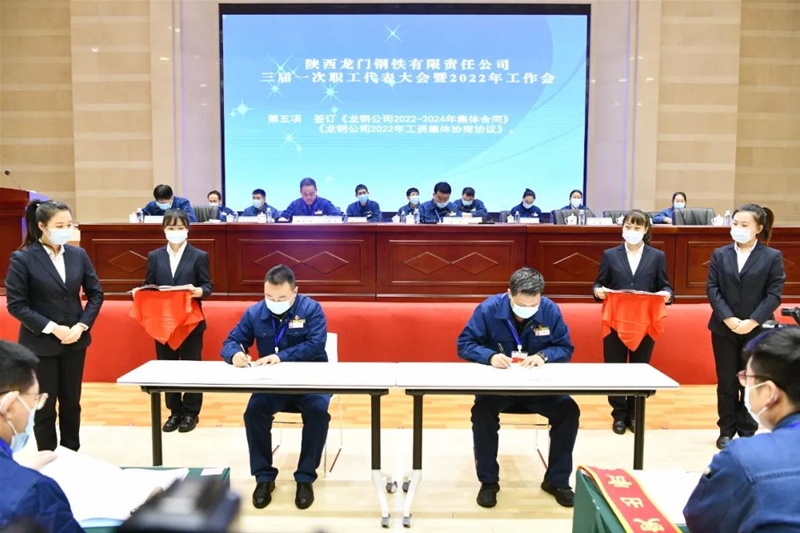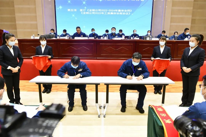 會上簽訂了《龍鋼公司2022-2024年集體合同》《龍鋼公司2022年工資集體協商協議》,以及《2022年度契約化經營業績責任書》《2022年度安全環保目標責任書》。