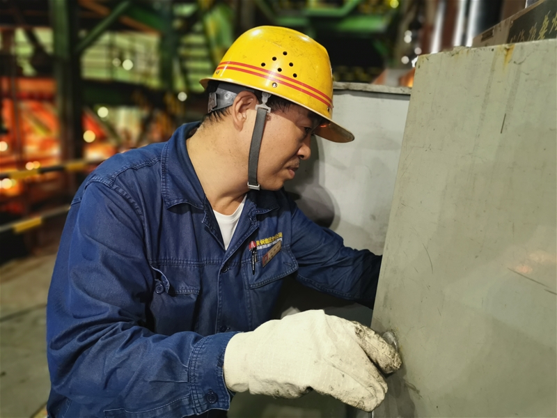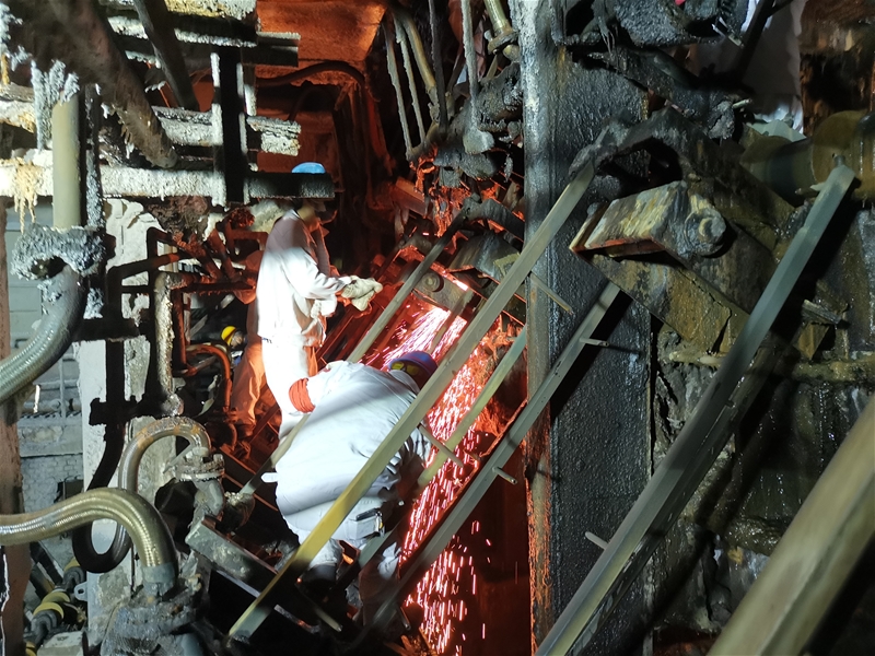 剛剛停機的現場,被熱浪團團包裹,像極了一個巨型蒸籠。檢修時間只有兩小時,這對他們來說,無疑是一個挑戰,大家等不及設備溫度降下來,就迫不及待地來到各自負責區域,一瞬間,澆鋼區、二冷室、拉矯機、輥道旁……人頭攢動、熱鬧非凡。二冷室內潮濕悶熱,作業環境復雜,讓人呼吸都變得困難,幾名身穿白色阻燃服的中包工,順著噴淋管爬上爬下,他們腳踩在細細的支架上。這群“蜘蛛俠”在縱橫交錯的管道間,隨意調整著身體,有的仔細清理噴咀,有的認真切割冷鋼,這看起來困難重重的工作,他們卻游刃有余。不一會,他們厚厚的工作服被汗水浸濕,臉上的汗水也在大負荷照明燈下泛著亮光。可盡管如此,他們的目光始終盯在設備上,沒有半分懈怠。