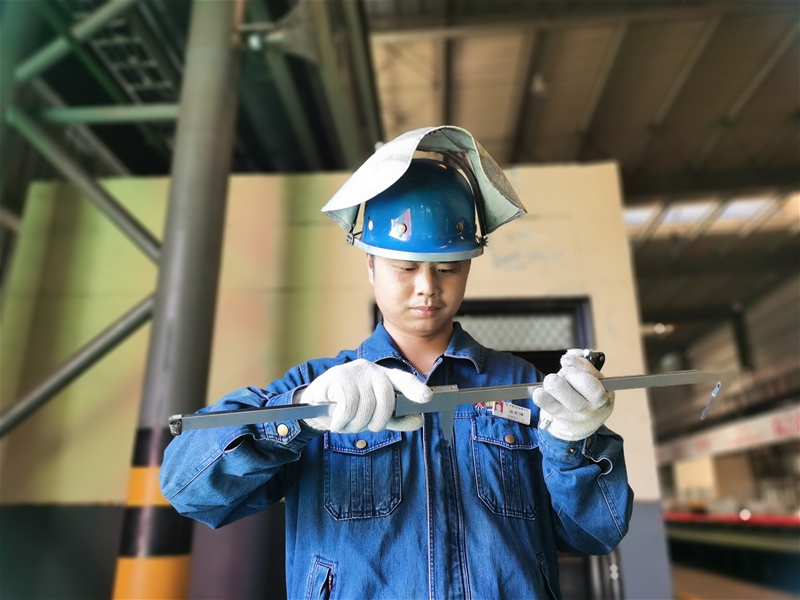 在周圍環(huán)境溫度達(dá)40℃的棒材三線,一股熱浪襲來(lái),作業(yè)長(zhǎng)張?chǎng)晤櫜簧现丝荆每ǔ邷y(cè)量棒材幾何尺寸,以實(shí)際行動(dòng)踐行“人人做精英,根根求精品”的“精”文化,確保生產(chǎn)出來(lái)的每一根鋼材都是精品。