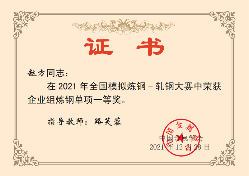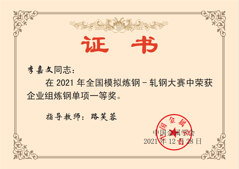 近日,從中國金屬學會傳來喜訊,公司煉鋼廠轉二作業區技術主管楊文學、煉鋼廠3#轉爐煉鋼工趙方、煉鋼廠5#轉爐煉鋼工李嘉文3名同志在2021年全國模擬煉鋼-軋鋼大賽中均榮獲企業組煉鋼單項一等獎。