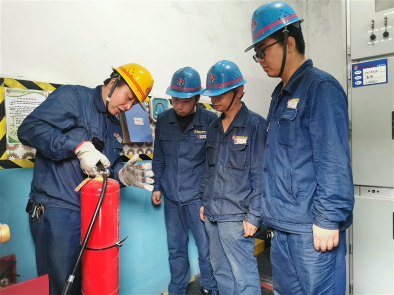 該作業區組織開展消防應急演練活動,為員工講解滅火器的構造和使用方法等消防知識,現場演示手提式干粉滅火器的正確使用方法,進一步增強員工基本防火常識和滅火自救技能,切實增強全員消防意識。按照消防應急預案,模擬配電室內線路短路起火,隨著一聲警報的拉響,人員立即快速對配電室配電柜滅火。演練過程中,班長重點講解日常生活中應注意的消防安全知識,從“防”得提前、“逃”得快速、“滅”得及時三個方面詳細講解了火災發生時的逃生方法 及應對措施,切實提高員工安全意識和應對突發事件的處置能力。